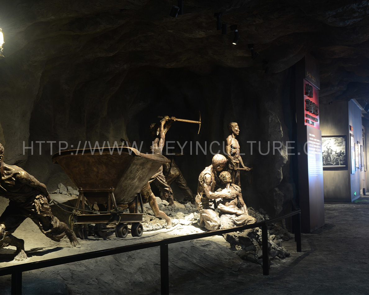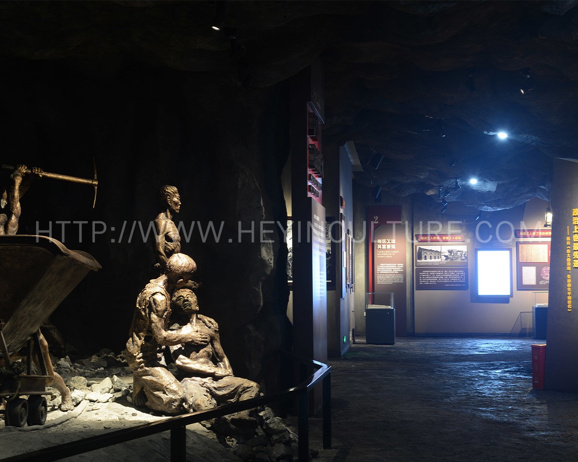 展現(xiàn)礦工們的悲慘境遇,背景是水口山礦的礦洞。同時,人物展現(xiàn)宋玉生累倒在宋喬生懷里的情形。墻壁上展示立體字:“十七十八學(xué)做窿,二十七八逞英雄。三十七八咬牙過,四十七八背竹筒?!?b>