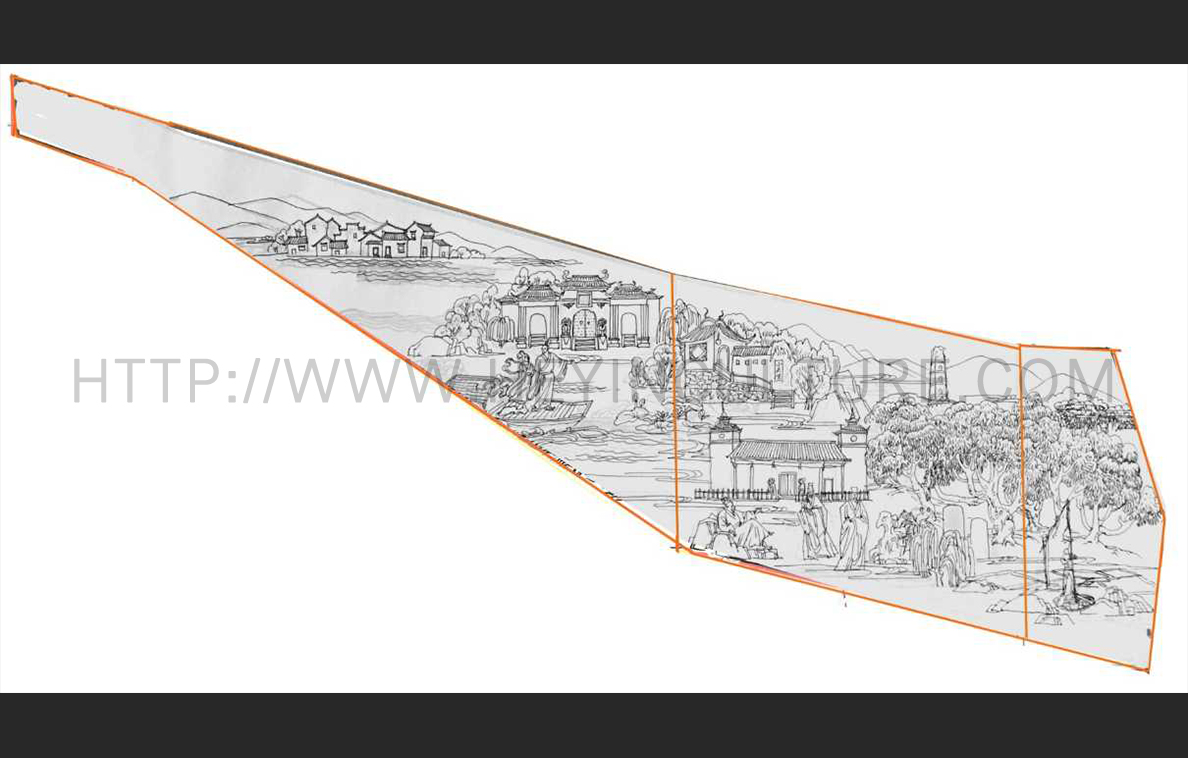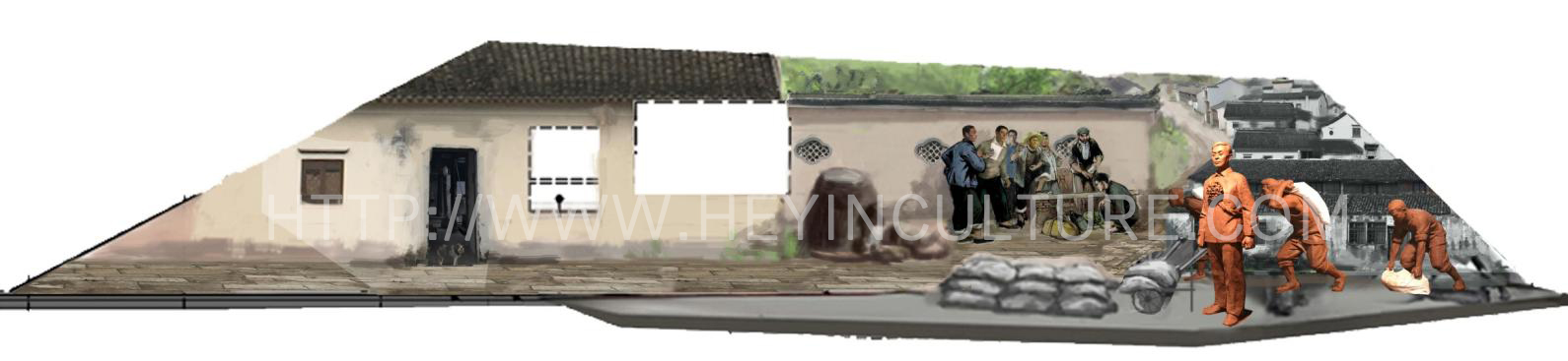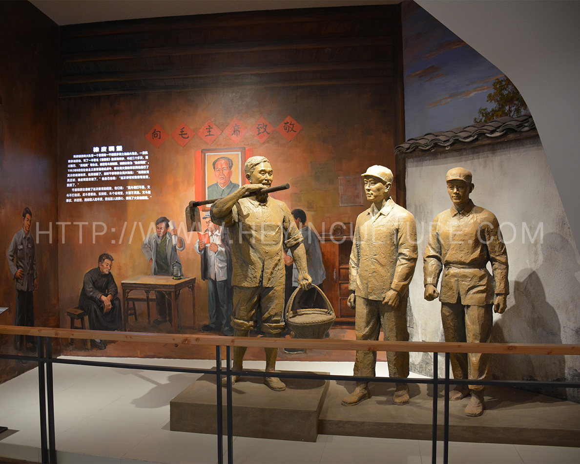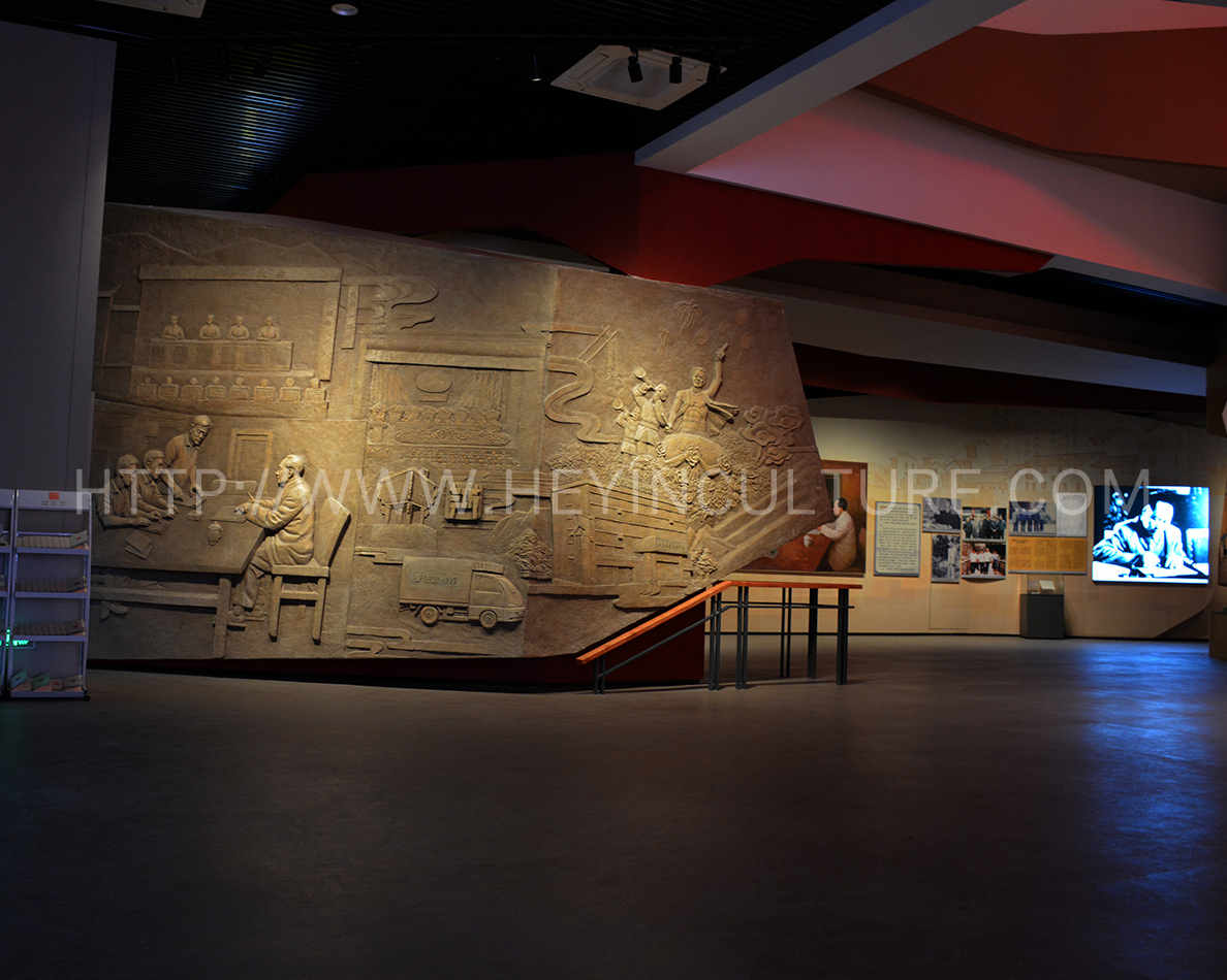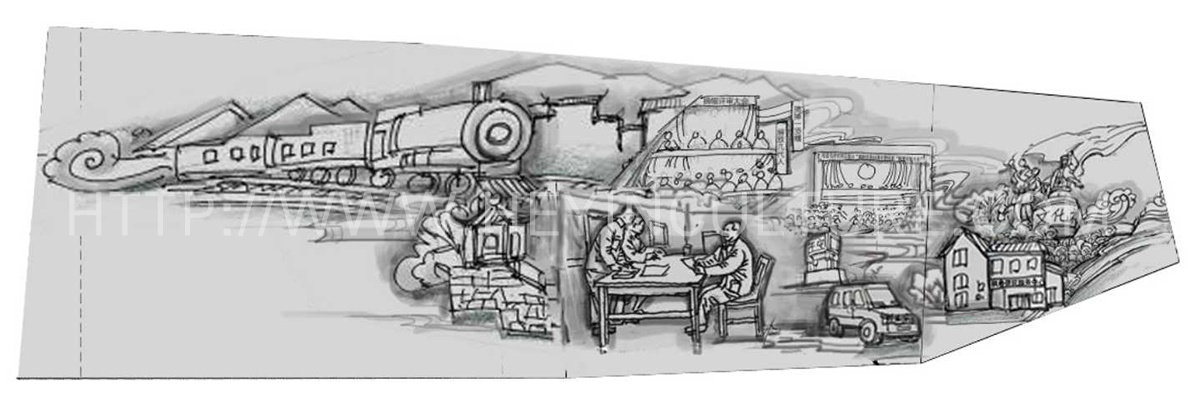 設(shè)計(jì)說(shuō)明:畫面分為壁畫與雕塑場(chǎng)景兩部分,壁畫部分表現(xiàn)破缸而逃,思想教育,雕塑表現(xiàn)的是駱某承包白泥廠之后,積極的勞動(dòng)場(chǎng)景。