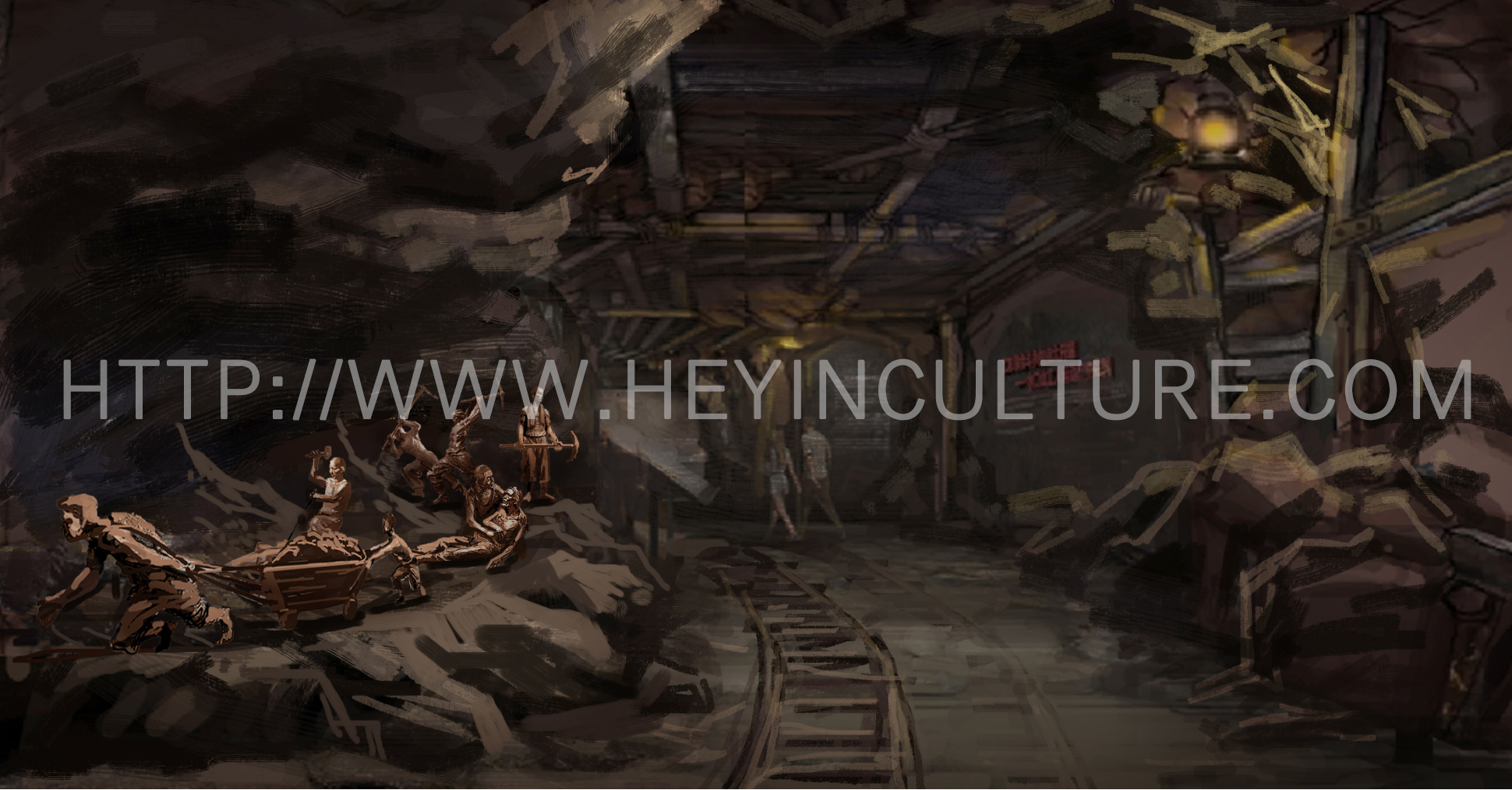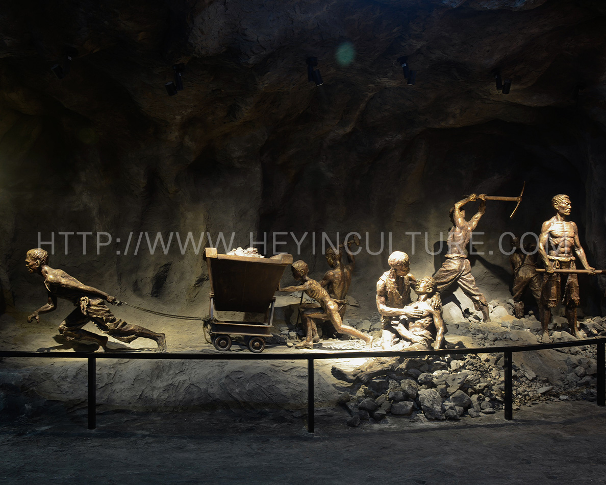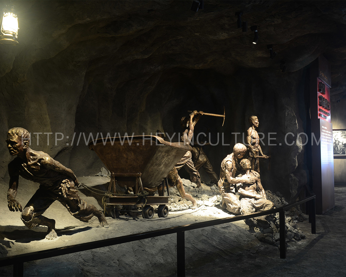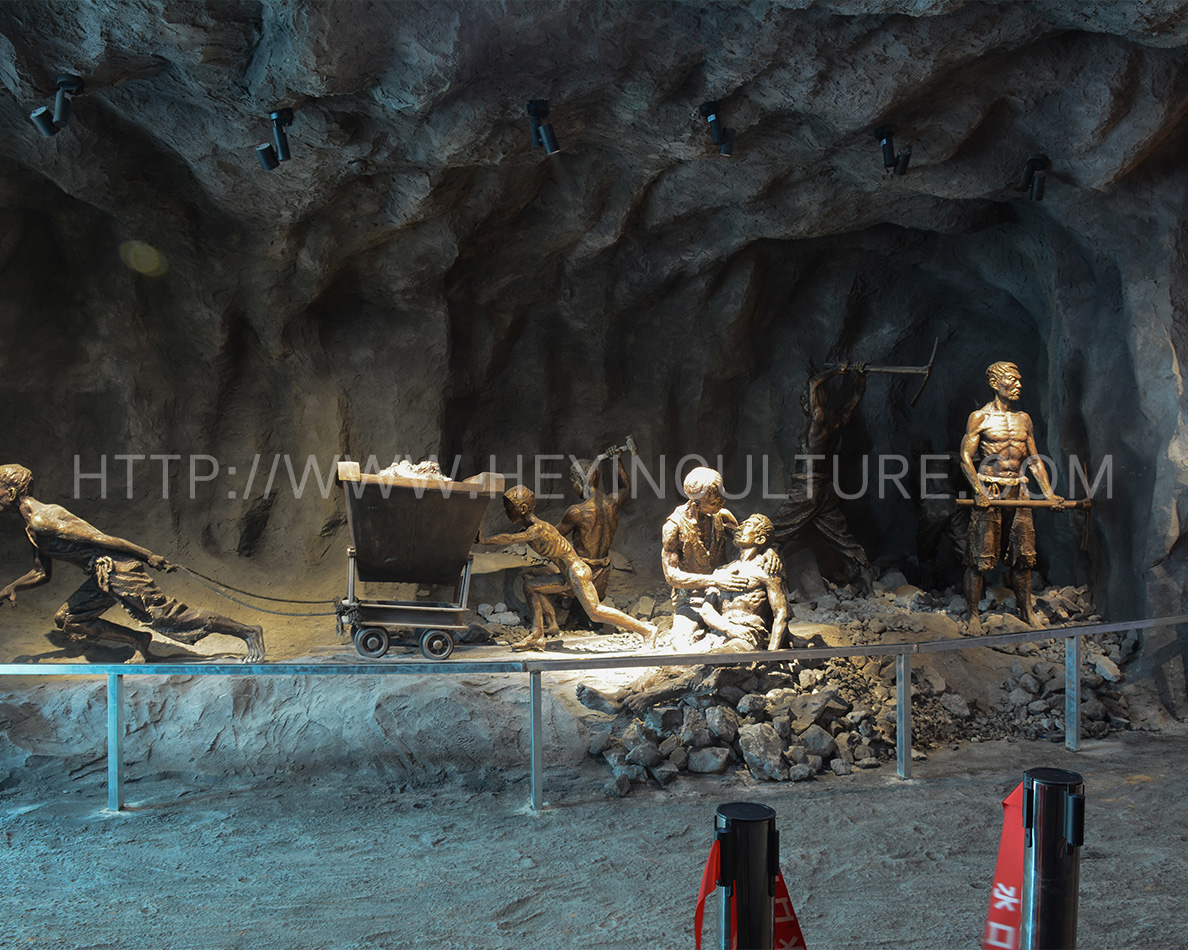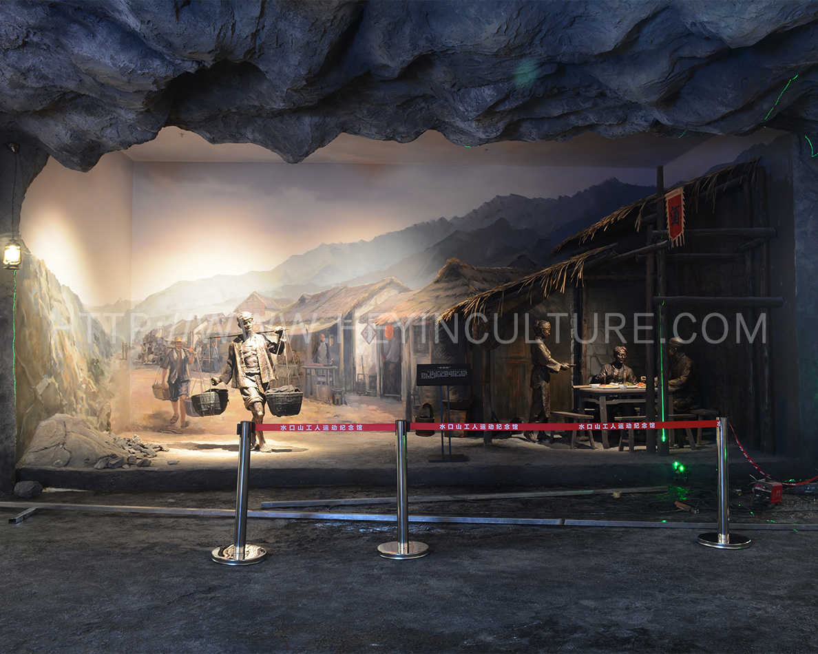 設(shè)計說明:展現(xiàn)礦工們的悲慘境遇,背景是水口山礦的礦洞。同時,人物展現(xiàn)宋玉生累倒在宋喬生懷里的情形。墻壁上展示立體字:“十七十八學(xué)做窿,二十七八逞英雄。三十七八咬牙過,四十七八背竹筒?!?/p>