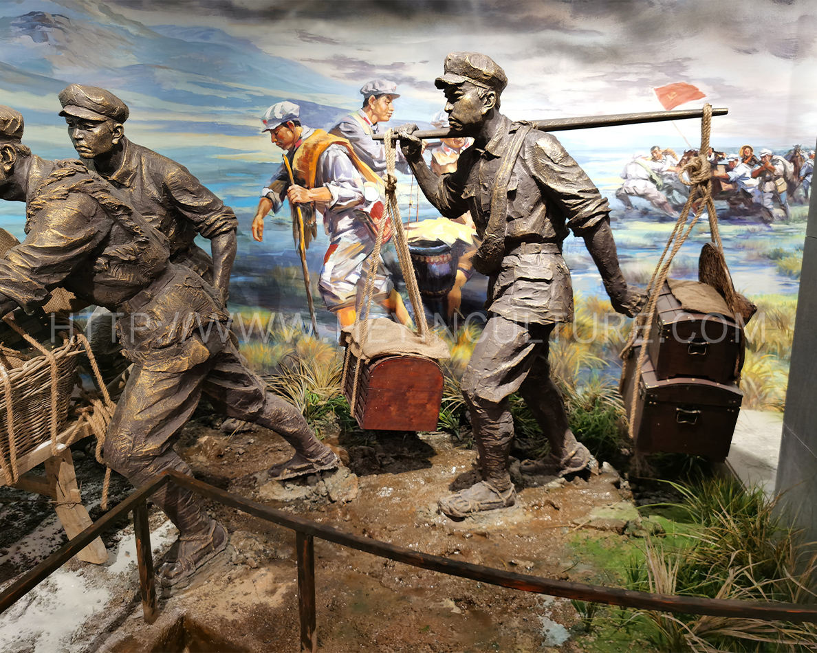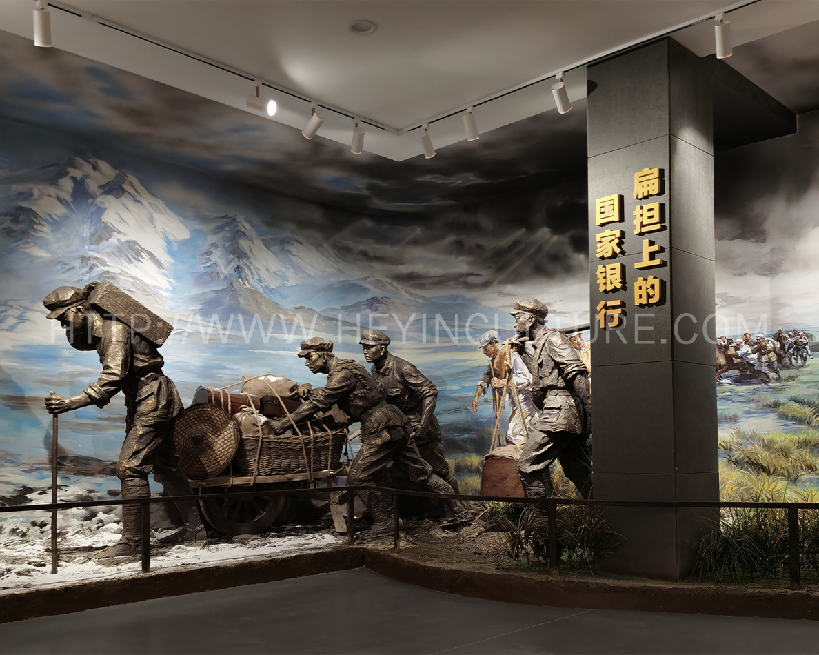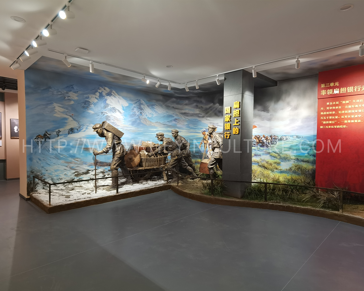 設(shè)計(jì)說明:講述長征路上,毛澤民率領(lǐng)中央縱隊(duì)第15大隊(duì)14位來自銀行的同志以及100多名運(yùn)輸員,用扁擔(dān)挑起中央紅軍的全部家當(dāng)——金子、銀元和部分紙幣“紅軍票”隨軍長征的故事。