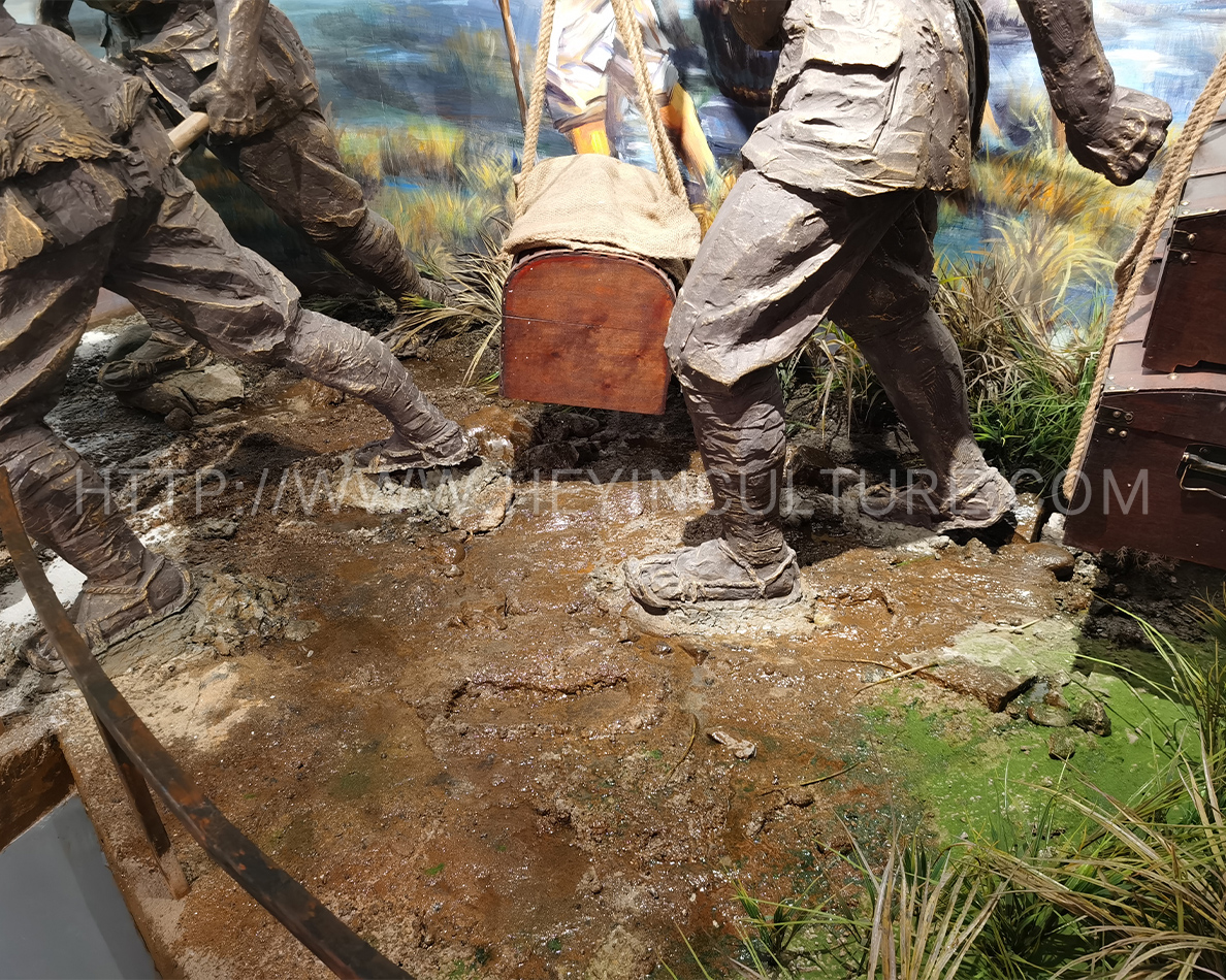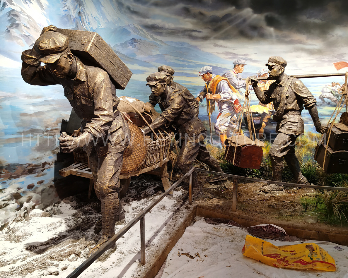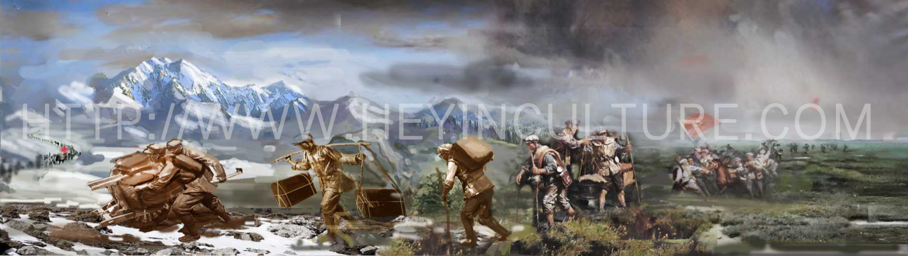 設(shè)計(jì)說明:講述長征路上,毛澤民率領(lǐng)中央縱隊(duì)第15大隊(duì)14位來自銀行的同志以及100多名運(yùn)輸員,用扁擔(dān)挑起中央紅軍的全部家當(dāng)——金子、銀元和部分紙幣“紅軍票”隨軍長征的故事。