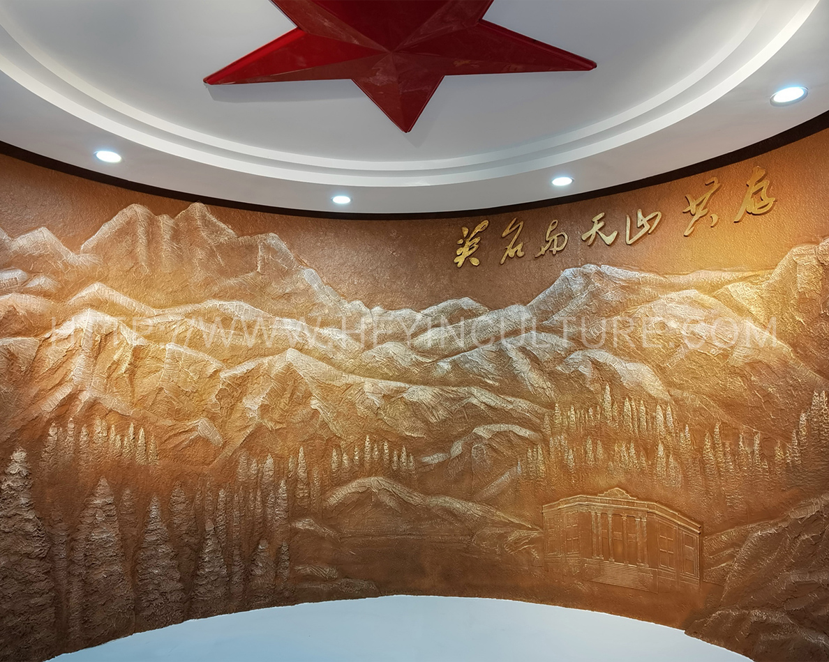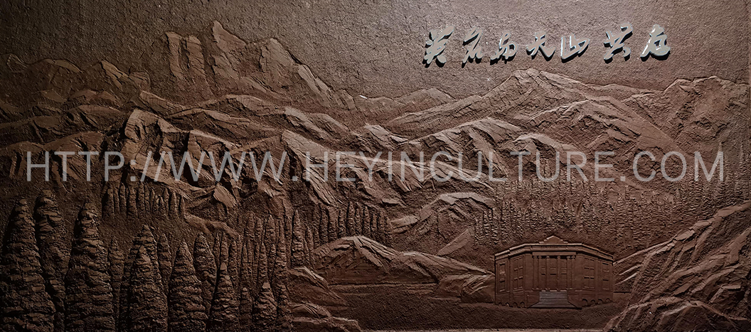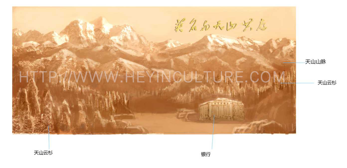 設(shè)計(jì)說明:浮雕主體背景為天山山脈;天山腳下用藝術(shù)抽象的形式,結(jié)合天山云杉與新疆商業(yè)銀行等體現(xiàn)毛澤民在新疆的主要貢獻(xiàn)以及體現(xiàn)毛澤民同志的革命奉獻(xiàn)精神。