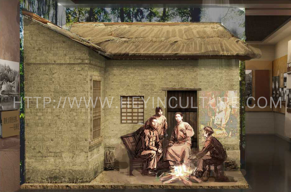 設(shè)計(jì)說明:1921年正月初八,毛澤東一家人圍坐在灶屋的火塘邊,慷慨激昂地給大弟弟毛澤民、小弟弟毛澤覃以及堂妹毛澤建講述革命道理,“教育全家干革命”,從此毛澤民三兄妹跟著毛澤東走出韶山?jīng)_,走上了革命的征程。